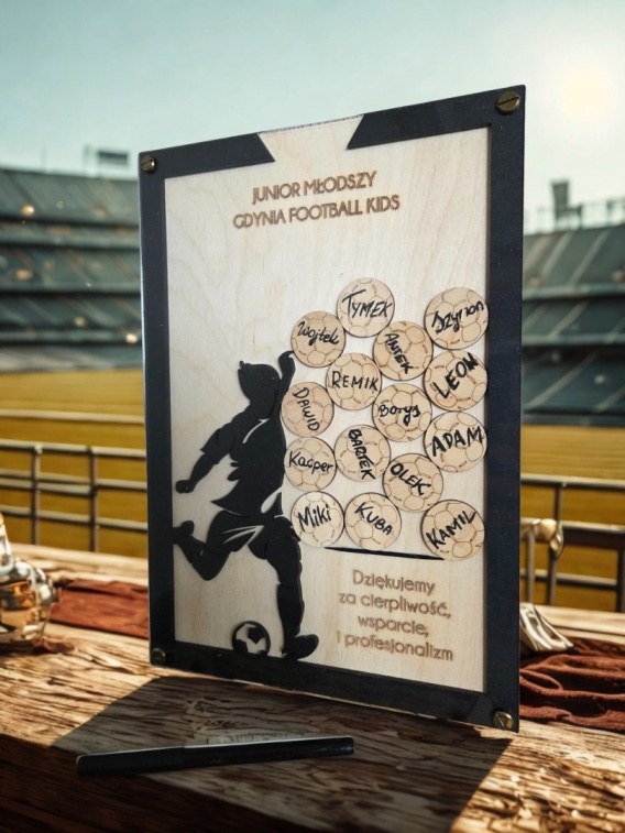 • Podpisy zawodników – do dyplomu dołączamy mini piłki ze sklejki, na których każdy zawodnik może się podpisać. To osobisty i wzruszający akcent.